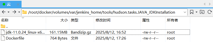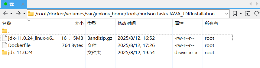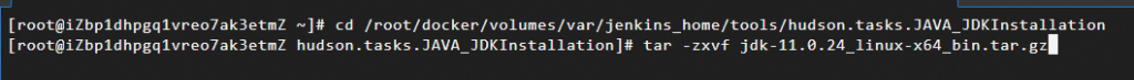 cd /root/docker/volumes/var/jenkins_home/tools/hudson.tasks.JAVA_JDKInstallation导航到这个目录,然后使用命令tar -zxvf jdk-11.0.24_linux-x64_bin.tar.gz解压这个压缩包到该目录