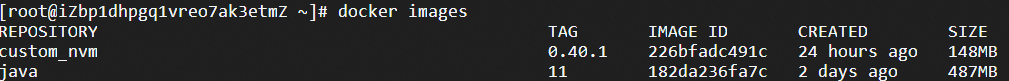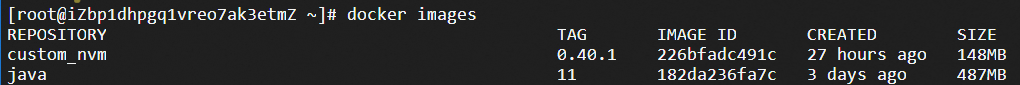 输入 docker images 查看有没有这个 java 的镜像文件 (custom_nvm 这个镜像文件后面也会配,如果你没有先别急)