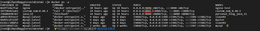 Linux>docker run –name custom_nvm_0.40.1 –restart always -p 8081:3000 -v /root/docker/volumes/nvm/usr/local/nvm/v0.40.1:/usr/local/nvm/v0.40.1 -d custom_nvm:0.40.1 (这里需要注意8081端口是否被占用或未开放)