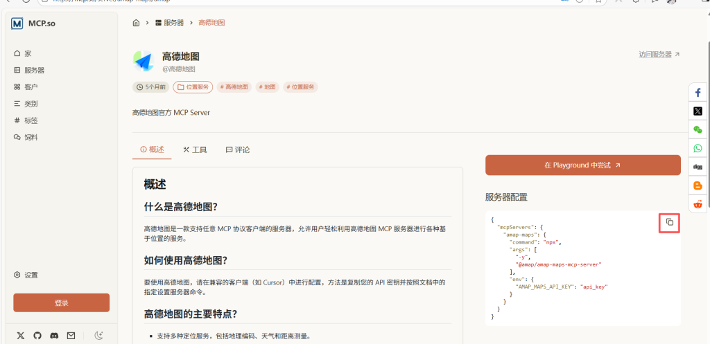 2、进入MCP.so网站获取高德地图的服务器配置代码