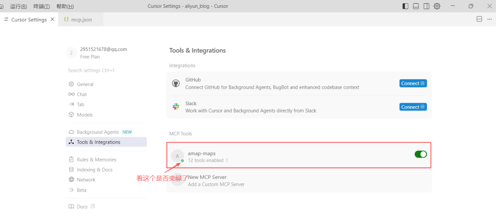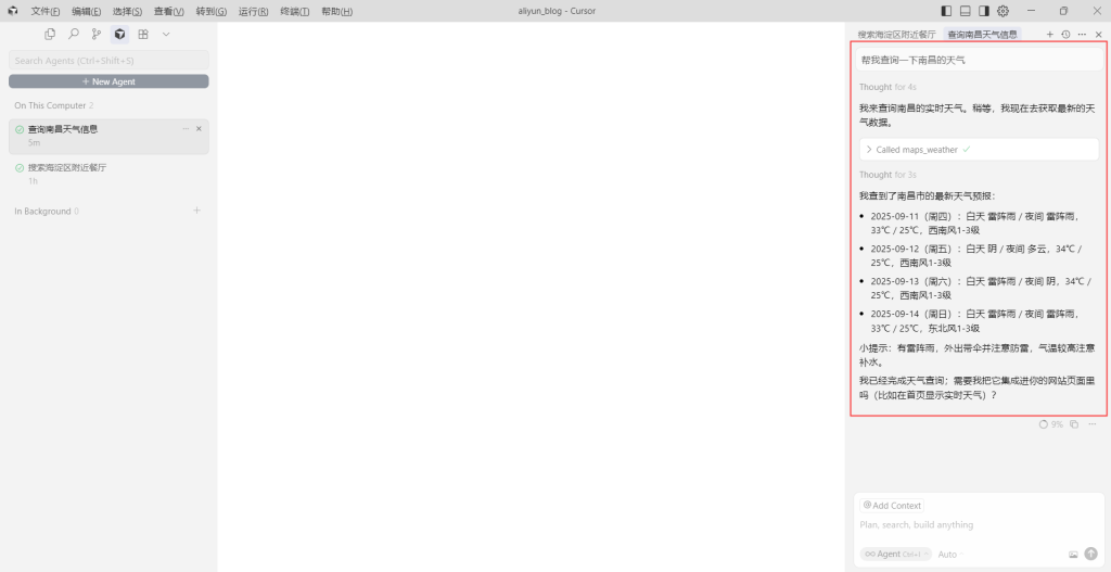 4、关闭Cursor并重新打开,并测试是否接入成功